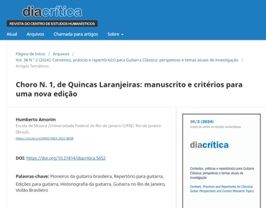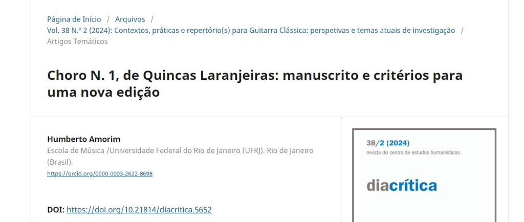 Acaba de ser lançado na Revista Diacrítica, da Universidade do Minho (Portugal), meu 41º artigo científico, o 28º dedicado à temática dos Pioneiros do Violão no Brasil. Seguem os links para a edição completa (V. 38 N. 2 /2024) e para o artigo específico: Choro N. 1, de Quincas Laranjeiras: manuscrito e critérios para uma nova edição.